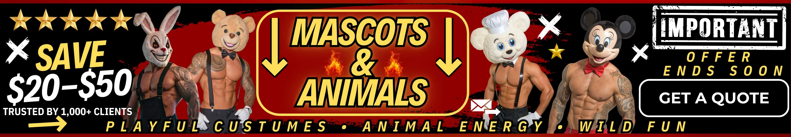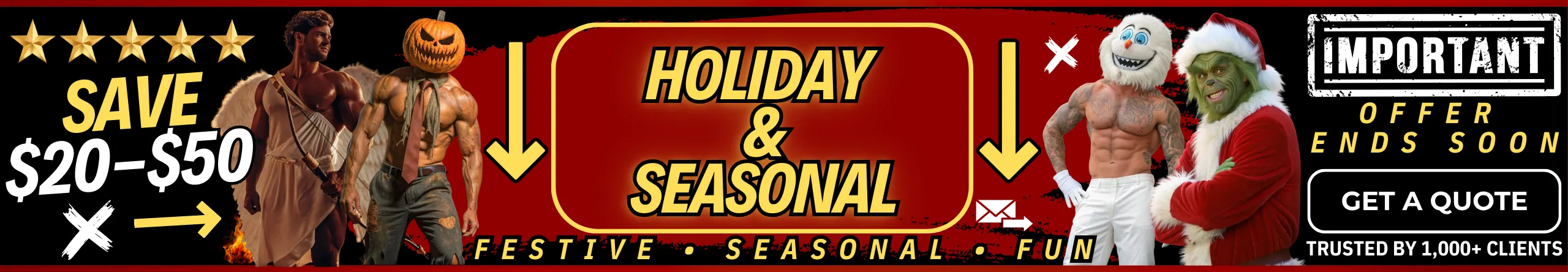 Celebrate the seasons in style with unforgettable looks like 🎅 Sexy Santa, 😇 Angel, 💚 Grinch, ⛄ Abdominal Snowman, 🧝 Elf, 🔥 Hot Krampus, 🎃 Pumpkin Head, 💘 Cupid, 🤡 Pennywise, 🦇 Beetlejuice, 🍀 Leprechaun, and 💀 Skeleton. Whether it’s Christmas, Valentine’s, Halloween, or St. Patrick’s Day, these festive favorites bring playful energy and a perfect holiday vibe to your party. Each outfit guarantees laughs, cheers, and memories that keep the celebration going long after the night ends.