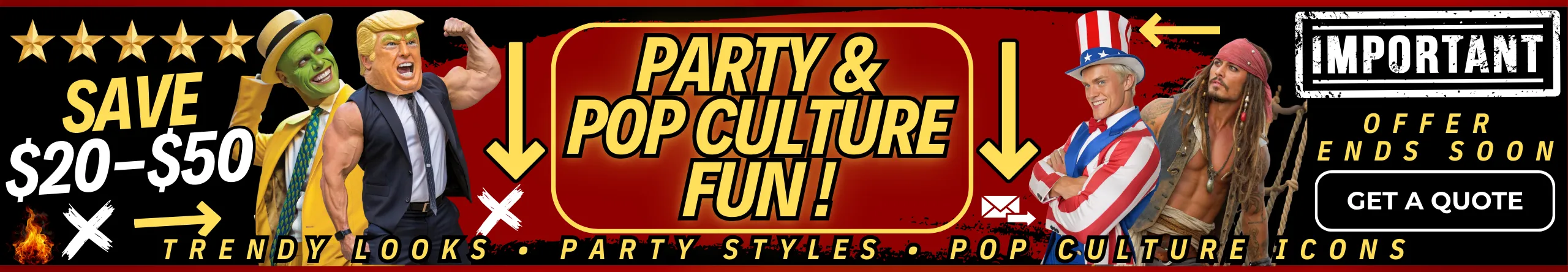 Step into the spotlight with iconic looks that bring laughter, nostalgia, and unforgettable style. Choose from 🎭 The Mask, 🟠 Donald Trump, 🇺🇸 Uncle Sam, 🕺 Ken Doll, 🎩 Magic Mike 2, 🏴‍☠️ Jack Sparrow, 🎸 Elvis Presley, ✨ Magician, 🏖️ Cabana Boy, 🖤 Goth, 🌿 Tarzan, and 🤪 Austin Powers. These crowd-pleasers are perfect for theme nights, birthdays, and parties that need a fun pop-culture twist—guaranteed to entertain and get everyone talking.