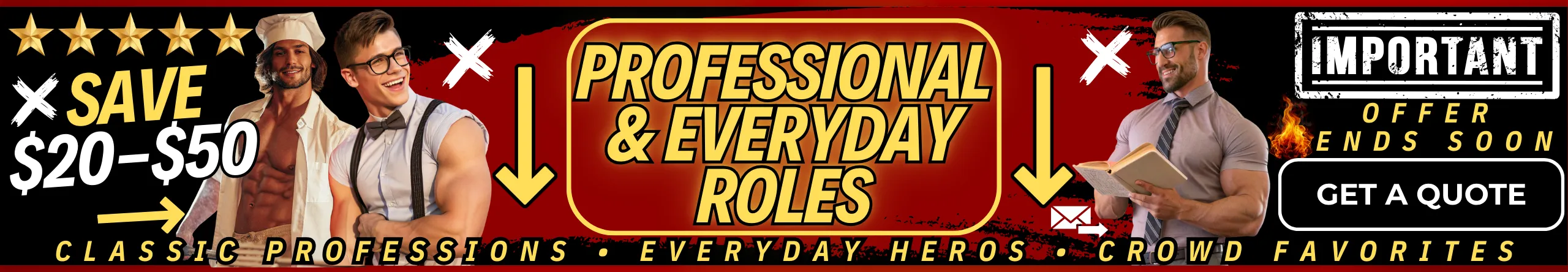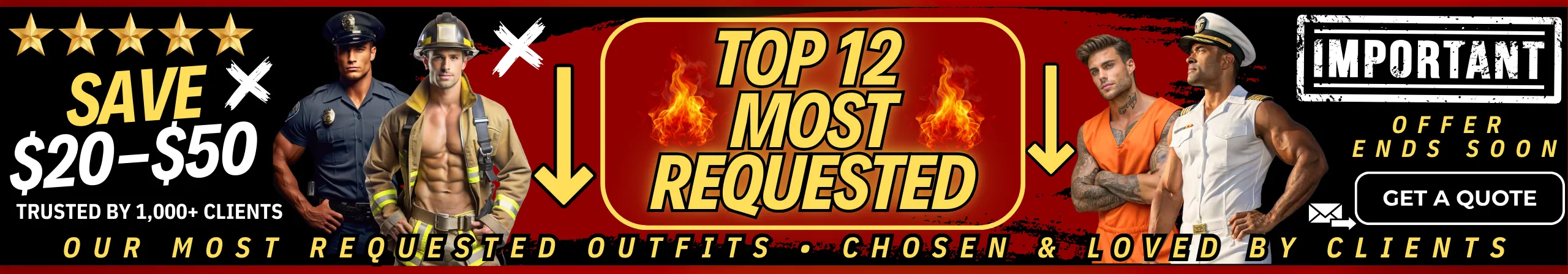 Our most popular looks include the 👨‍🚒 Fireman, 🩺 Naughty Doctor, 👮 Cop, 🎩 Magic Mike, 🍕 Pizza Boy, 🚔 Prisoner, 🔧 Plumber, 🤠 Cowboy, ⚖️ Lawyer, 🖤 50 Shades Dom, ⚓ Navy Captain, and 🎖️ Soldier Boy. These client favorites are the ultimate choices for bachelorette parties, birthdays, and special events—bringing excitement, fantasy, and unforgettable entertainment every time.